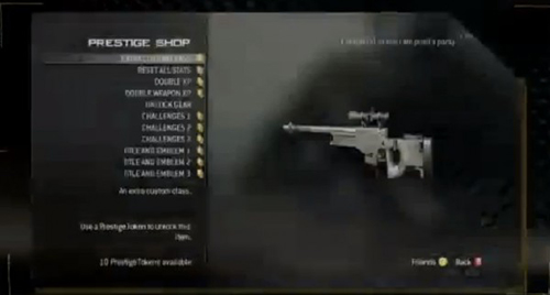 Es wird also scheinbar möglich sein sich extra Klassenplätze zu kaufen. Inwiefern dafür das automatische Freischalten von mehreren Klassenplätzen beim Prestigen wegfällt, ist nicht bekannt. Weiterhin lassen sich scheinbar die Stats gegen Punkte zurücksetzen. Man kann Doppelte Erfahrung sowohl für sich selbst, als auch für seine Waffen erkaufen. Außerdem wird es möglich sein, Ausrüstung wie Waffen oder Granaten freizuschalten. Wie der Begriff Challenges zu verstehen ist, ist ebenfalls unklar, ob dies nun bedeutet, dass man sich Challenges gegen Tausch von Punkten erfüllen lassen kann, oder aber lediglich zum Erfüllen freischalten, ist nicht sicher. Als letzte Option ist es offenbar möglich Titel und Embleme zu kaufen. Es scheint also wieder Embleme zu geben!